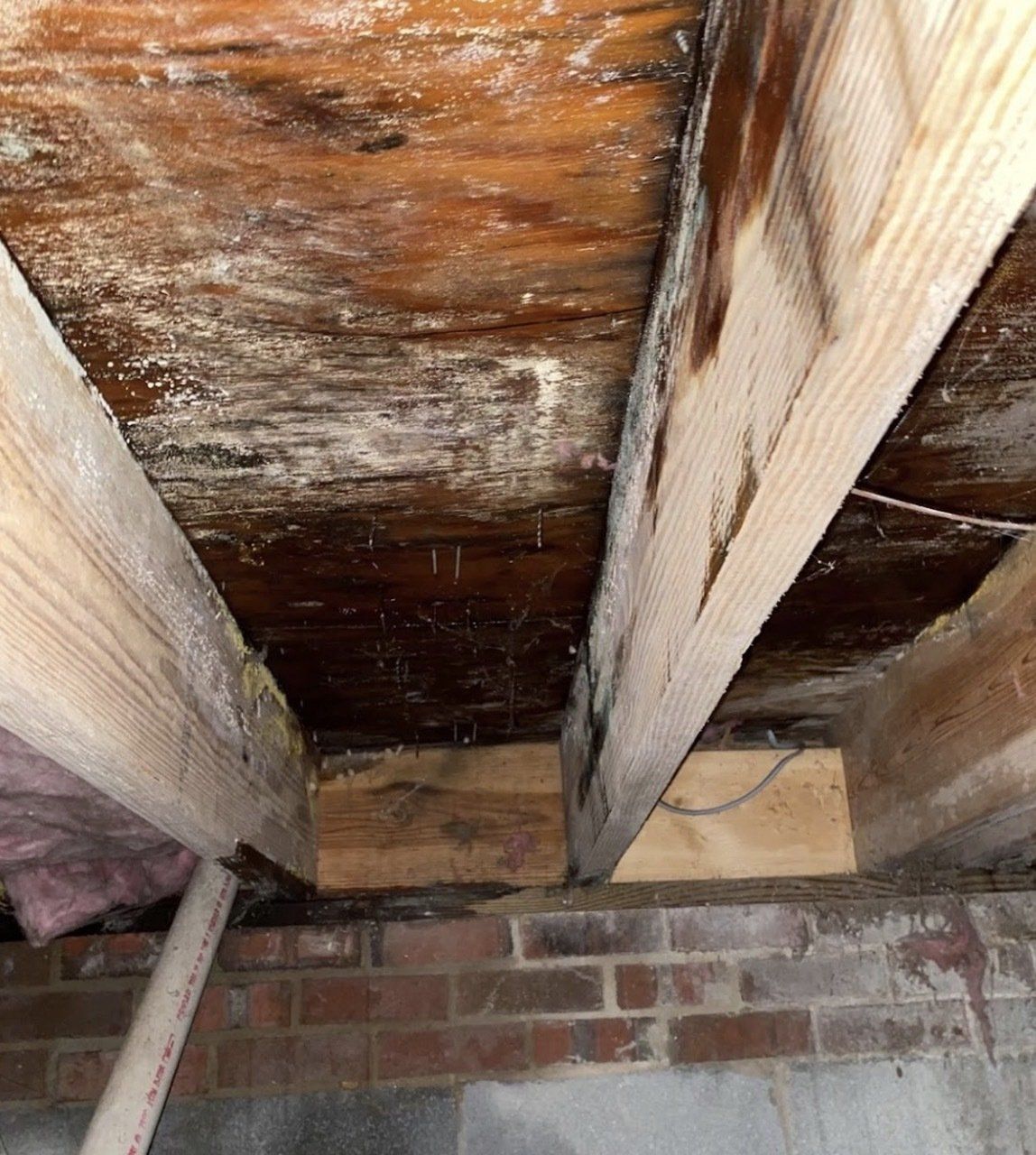 A hot water supply line pipe ruptured in the crawlspace at this Garner, NC home. Water affected the insulation and subfloor. Water being in a stagnant state for a period of time without drying techniques being performed created mold. FCWDE proceeded with mold remediation before applying drying equipment.
