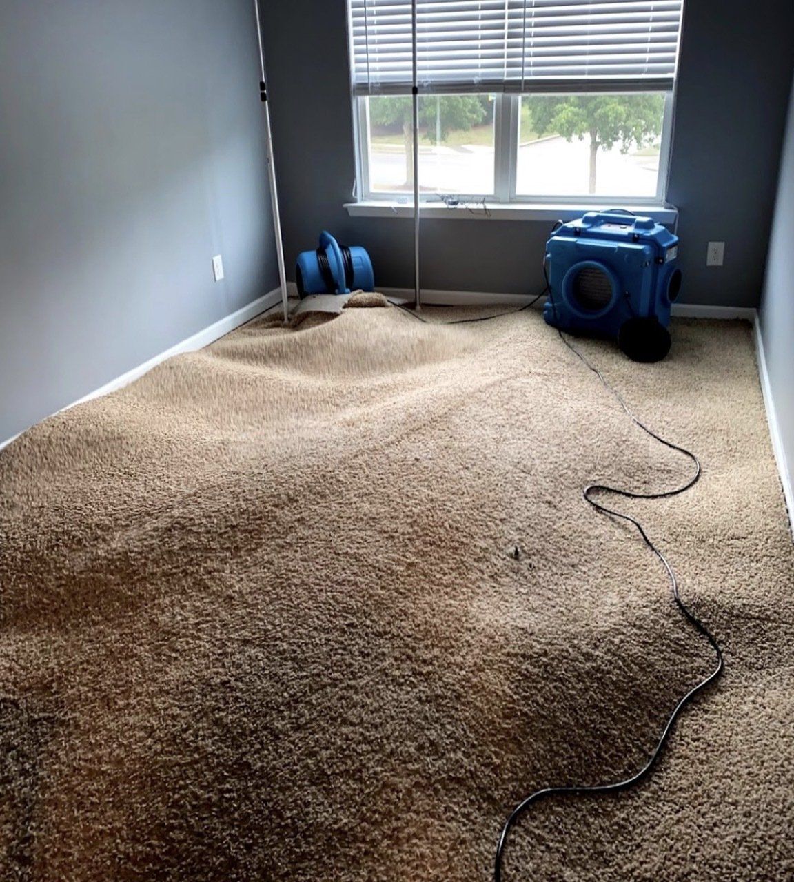 Water from a washing. machine malfunction in Chapel Hill affected the upstairs carpet and downstairs ceiling. FCWDE received the call within 12 hours and was able to save the carpet/pad by applying the proper drying techniques.